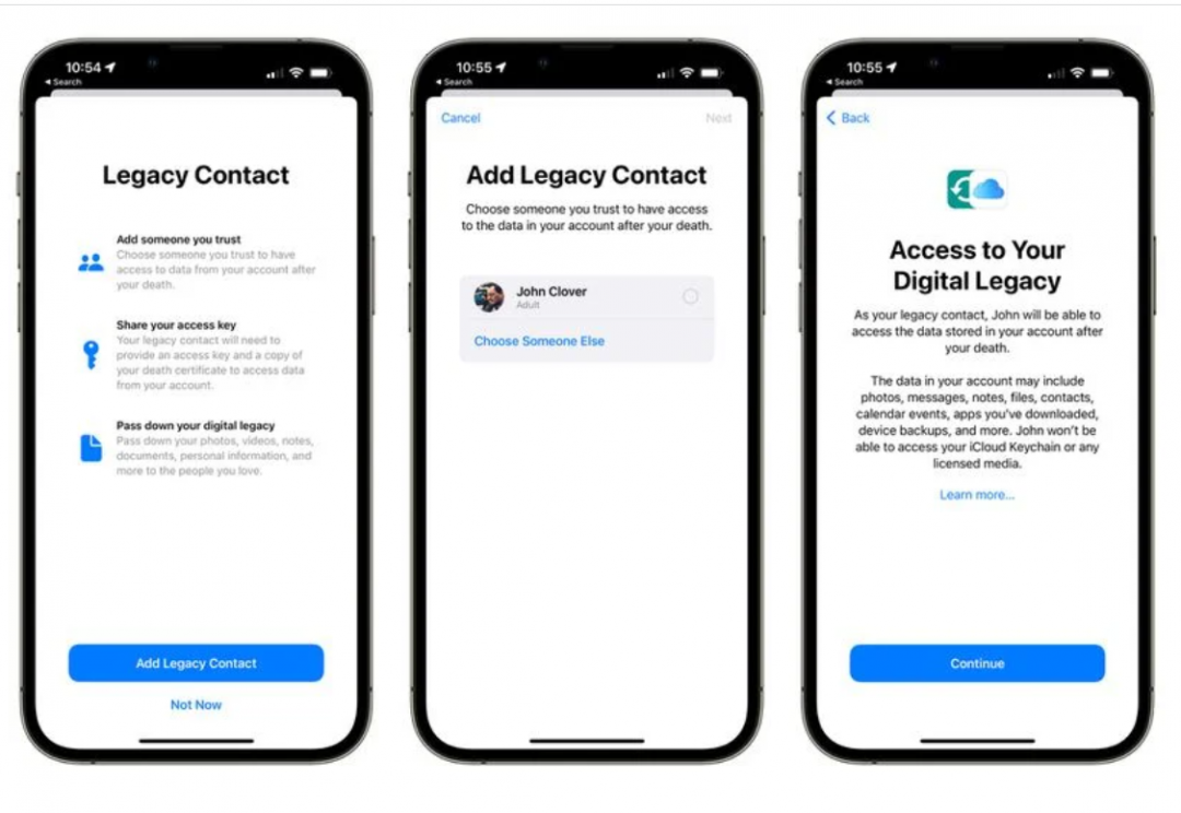 点选个人Apple ID帐号后,可于「密码与安全性」选单内,找到「遗产联络人」的选项,可指定由哪位联络人拥有取用自己帐号的权限登入,并于获得取用密钥与该帐号死亡证明副本的情况下,才能取用观看所有储存在iCloud的照片、讯息、档案、装置备份等帐号资料。不过,「iCloud 钥匙圈」与任何已授权的媒体则无法被指定的数位遗产继承人取用。